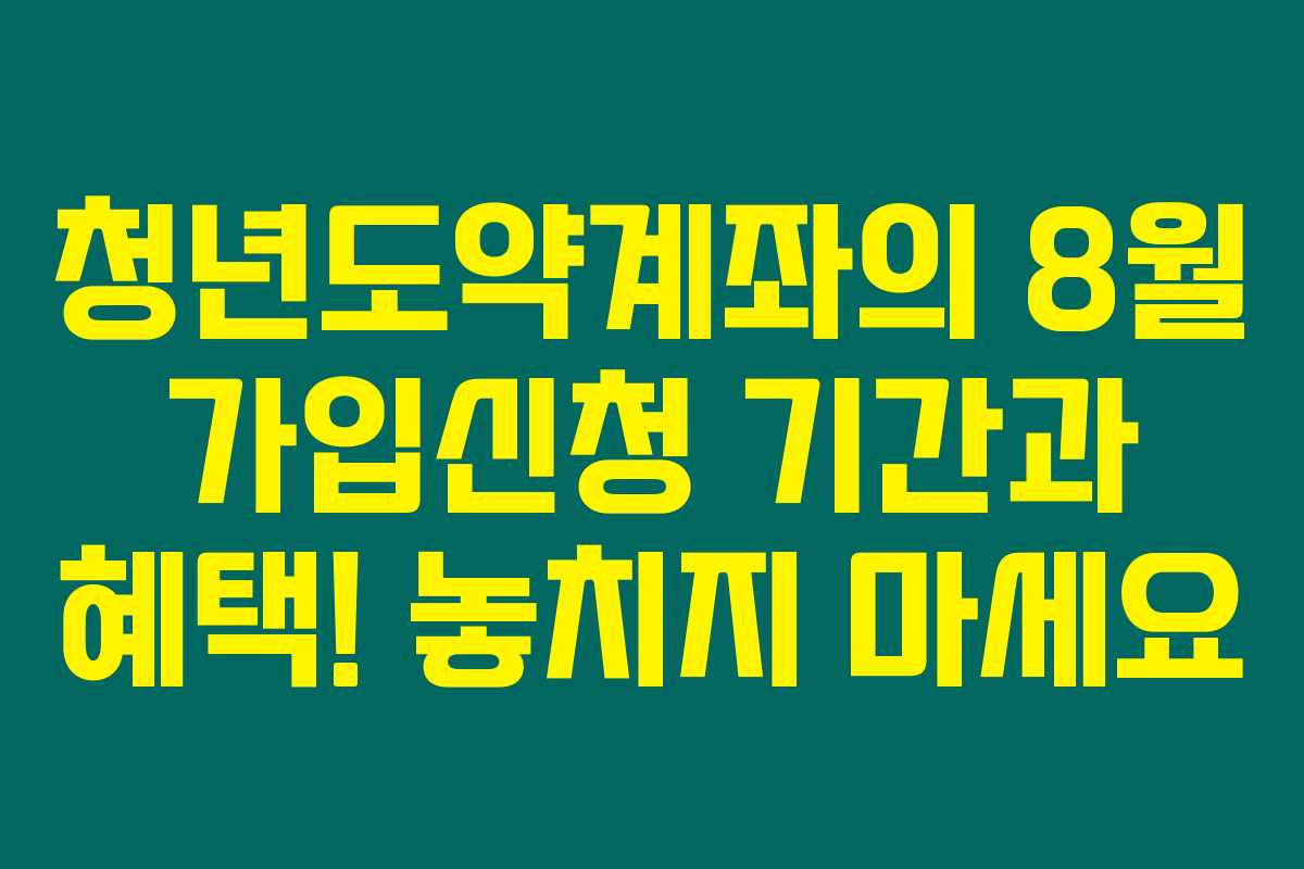 청년도약계좌를 통해 정부 지원과 함께 저축을 극대화하고 싶다면 꼭 확인해야 할 소식이 있어요! 8월 가입신청 기간이 다가오고 있는데요. 이번 기회에 청년도약계좌의 장점과 혜택을 놓치지 않길 바랍니다. 특히 정부에서 제공하는 지원금은 청년에게 큰 도움이 될 수 있으니 자세한 내용을 아래에서 확인해보세요.