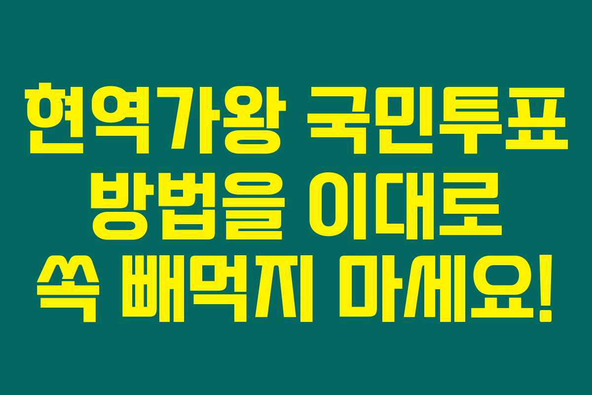 현역가왕 국민투표 방법은 생각보다 간단하죠? 위의 방법들을 따라 한번 해보세요! 팬들의 소중한 한 표가 스타를 만들어줄 수 있으니까요. 여러분의 응원이 현역가왕의 참가자들에게 큰 힘이 될 거예요.