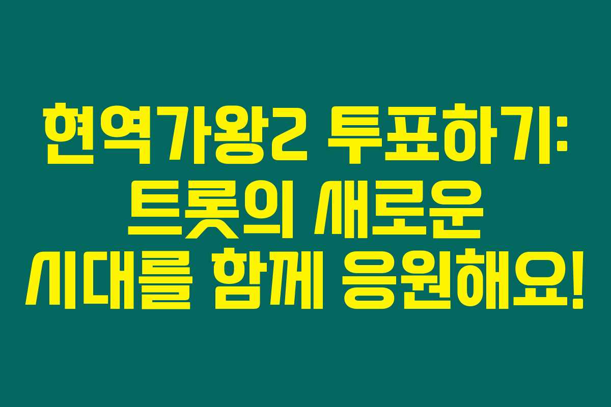 이번 기회에 현역가왕2 투표하기를 통해 소중한 팬의 목소리를 내보세요! 여러분의 응원이 대한민국의 트롯 음악을 더욱 빛나게 할 거랍니다. 많은 참여 부탁드려요!