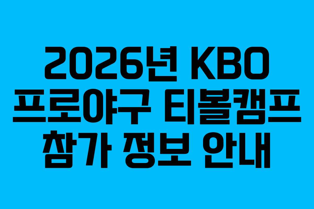 2026년 KBO 프로야구 티볼캠프는 2026년 7월 9일부터 7월 22일 16시까지 모집한다. 이 캠프는 초등학생 자녀를 둔 가족을 대상으로 하며, 초등학생 1명과 보호자 1명으로 구성된 가족이 신청할 수 있다. 가족이 함께 야구를 경험하고, 야구 팬이 되고자 하는 분들께 적합한 프로그램이다.