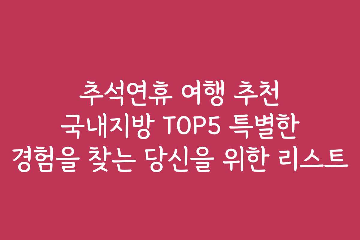 추석 연휴를 맞아 특별한 여행을 계획하고 계신가요? 다양한 국내 지방에서 특별한 경험을 할 수 있는 여행지 TOP5를 소개합니다. 이번 기회를 통해 가족, 친구들과 함께 소중한 추억을 만들어 보세요.